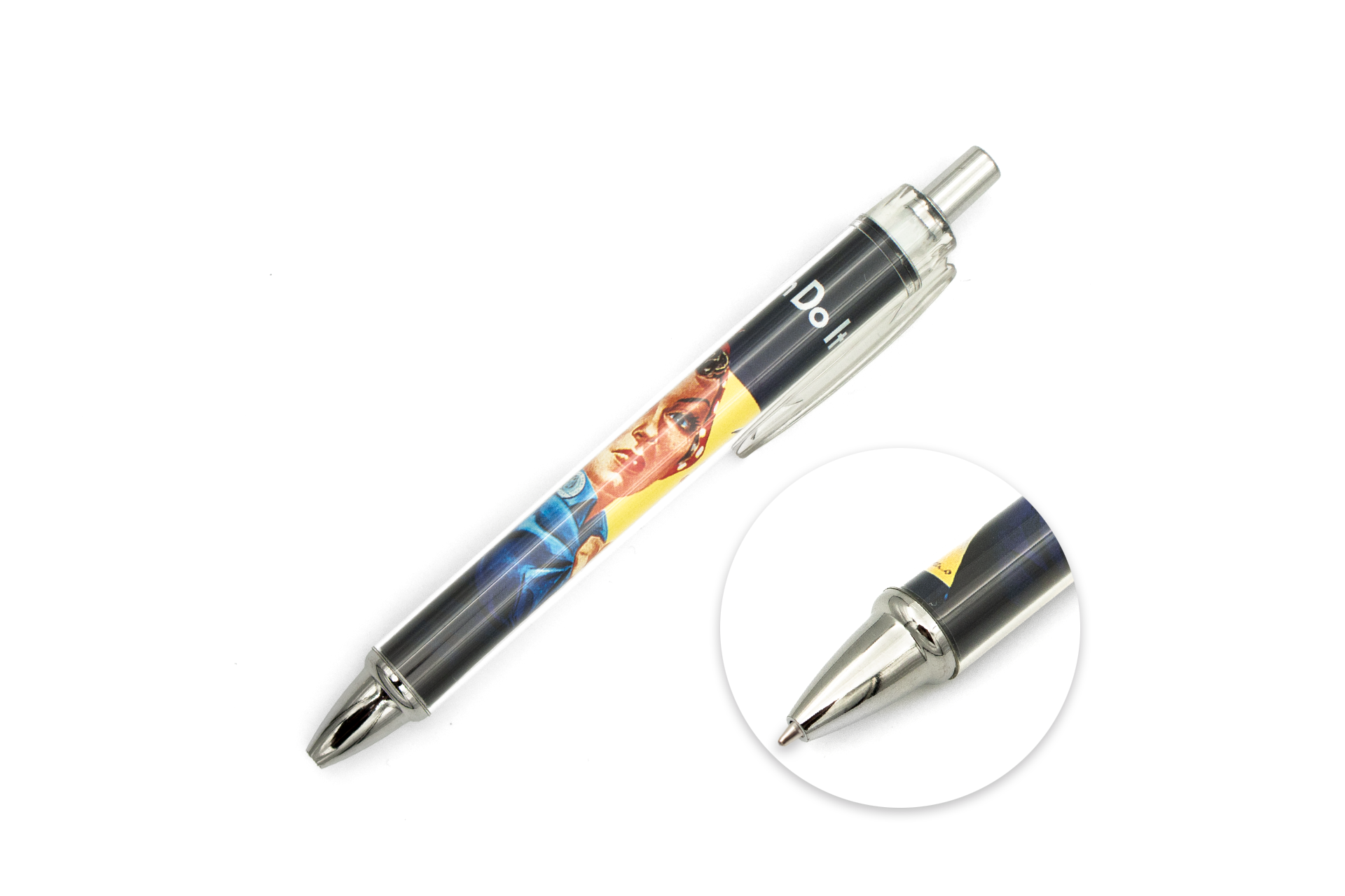 Entdecken Sie diesen einzigartigen Fotokugelschreiber mit dem Aufdruck des bekannten Posters „We Can Do It“. Das Bild befindet sich hinter einer transparenten Schutzschicht und besticht durch seine ansprechende Optik. Der Stift schreibt mit blauer Tinte f