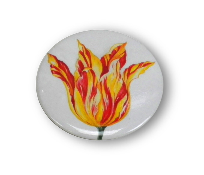 Runder Spiegel, praktisch zum Mitnehmen, um beispielsweise das Make-up zu aktualisieren. Dieser Spiegel im Taschenformat ist in Plastik eingewickelt und hat einen wunderschönen Druck einer Zeichnung von Jakob Marrel (1613 - 1681): Gelb - Rote Tulpe.