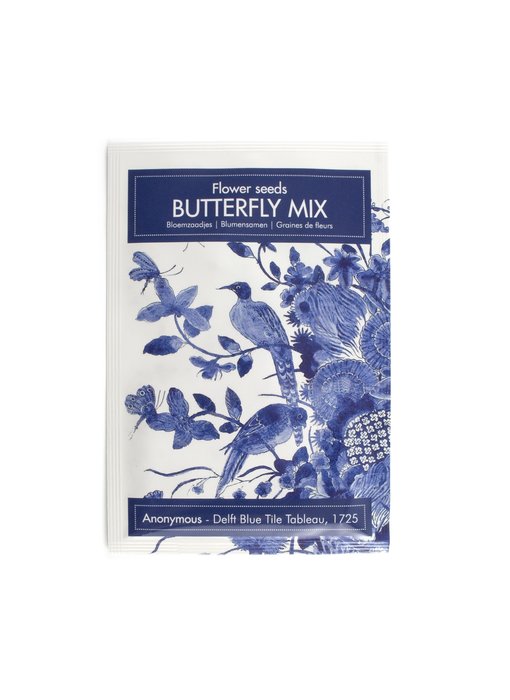 Samen für Blumen, die Schmetterlinge lieben, in einer schönen Tasche, die Sie als Postkarte verschicken können: inspiriert von einer Fliesenplatte, die im Rijksmuseum in Amsterdam hängt.