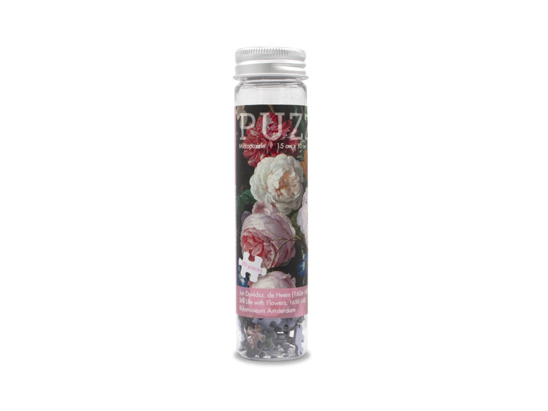 Minirompecabezas de Bodegón de flores, De Heem El rompecabezas de 150 piezas se presenta en un tubo con tapón de rosca. Medidas: 10 x 15 cm. Marca: Museum-merchandise.comaMinirompecabezas de La joven de la perla de Vermeer. El rompecabezas de 150 pie
