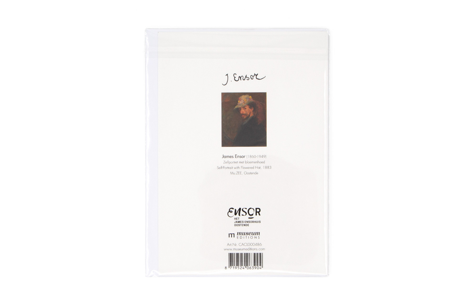 Tarjeta doble con sobre, James Ensor, Autorretrato con capucha floreada