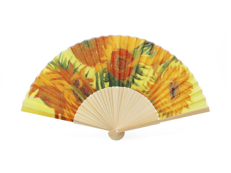 matériel: éventail en bambou avec tissu imprimé dans une boîte en carton