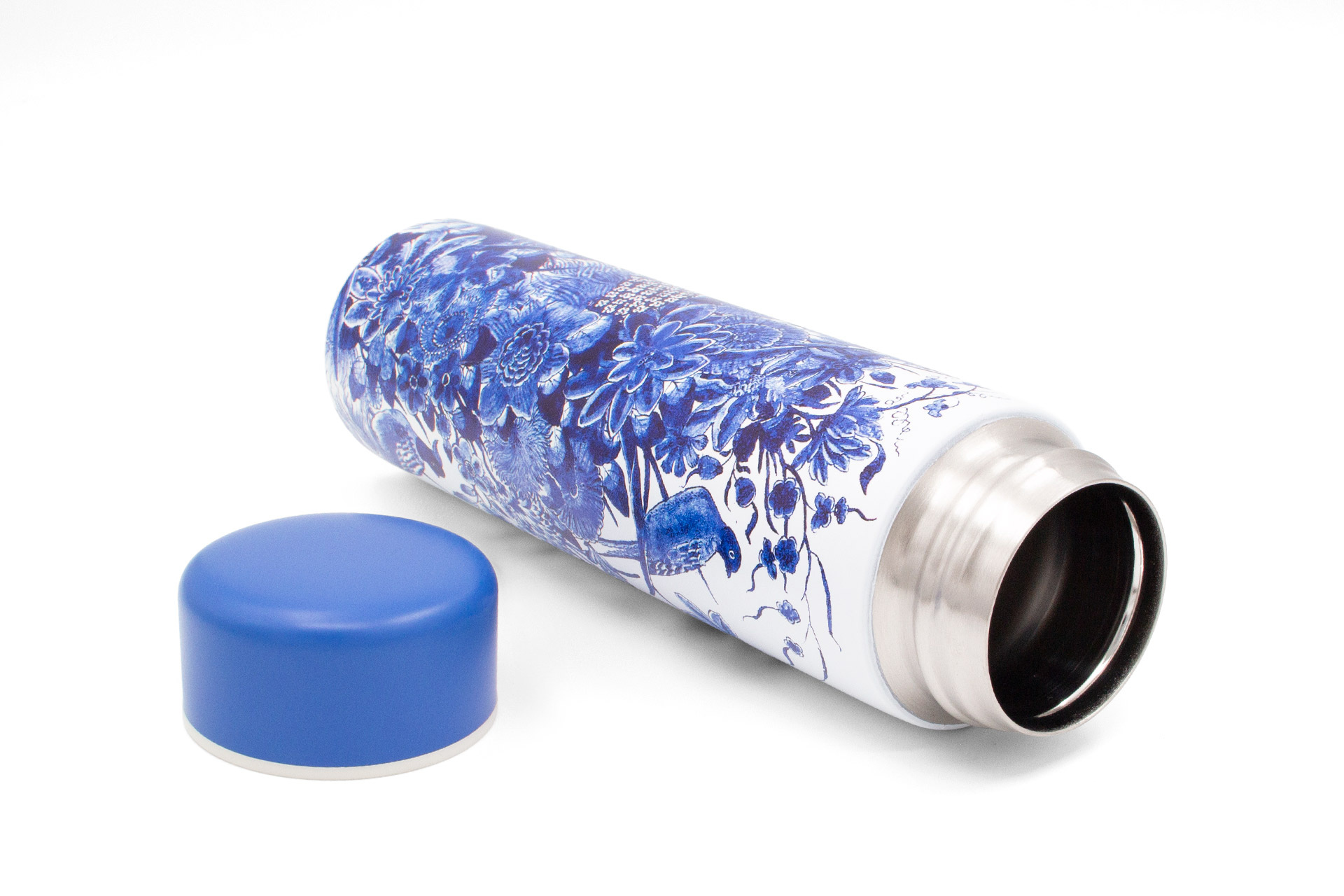 Belle bouteille thermos de voyage élancée pour boissons chaudes ou froides. Avec une illustration inspirée d’un panneau de carreaux du Rijksmuseum à Amsterdam. Compatible lave-vaisselle.