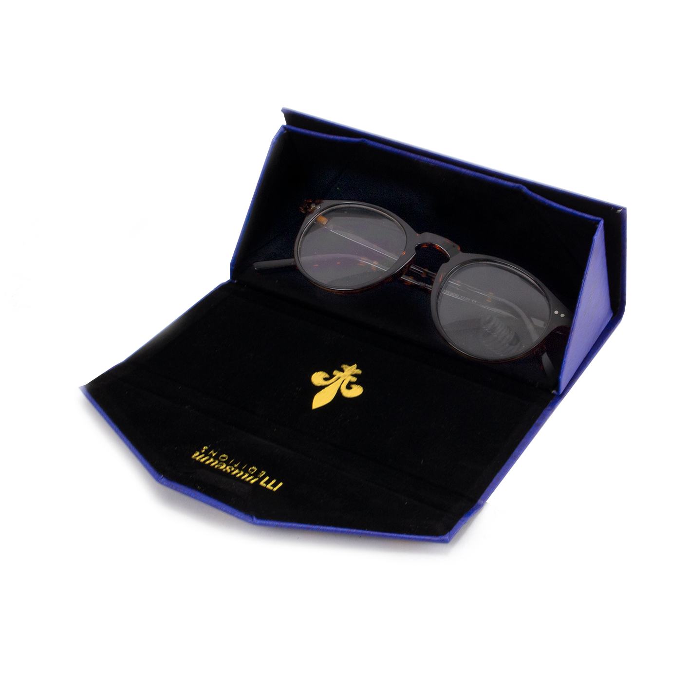 De brillendoos vouwt uit tot een stevige driehoek, met een zachte fluwelen bekleding aan de binnenkant. Dit zorgt ervoor dat je bril veilig en krasvrij opgeborgen blijft. Het unieke design, geïnspireerd door beroemde kunstwerken, maakt deze koker niet alleen praktisch, maar ook een stijlvol accessoire.