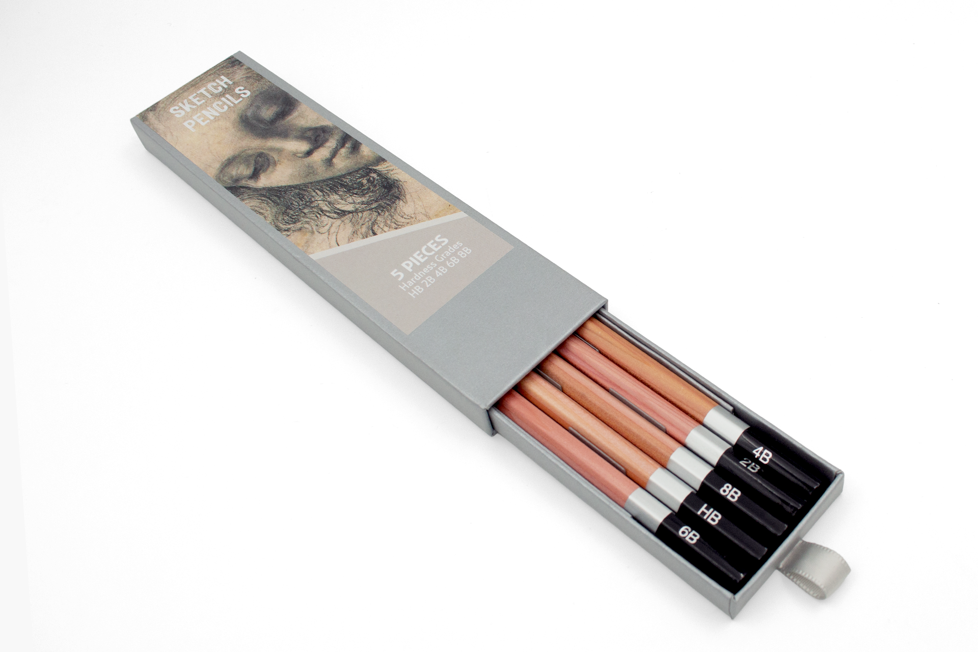 Set van 5 HB-potloden in een zilverkleurige doos.